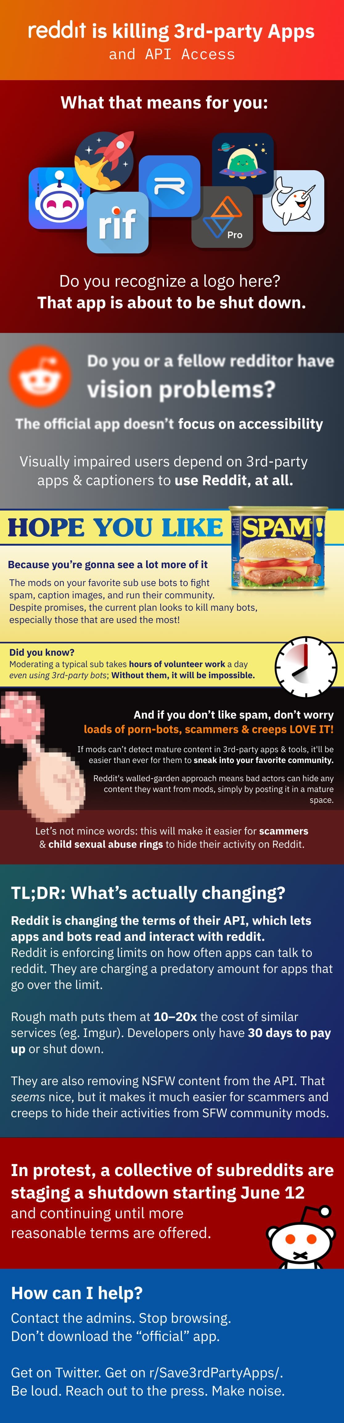 > On June 12th, many subreddits will be going dark to protest this policy. Some will return after 48 hours: others will go away permanently unless the issue is adequately addressed, since many moderators aren’t able to put in the work they do with the poor tools available through the official app. This isn’t something any of us do lightly: we do what we do because we love Reddit, and we truly believe this change will make it impossible to keep doing what we love.