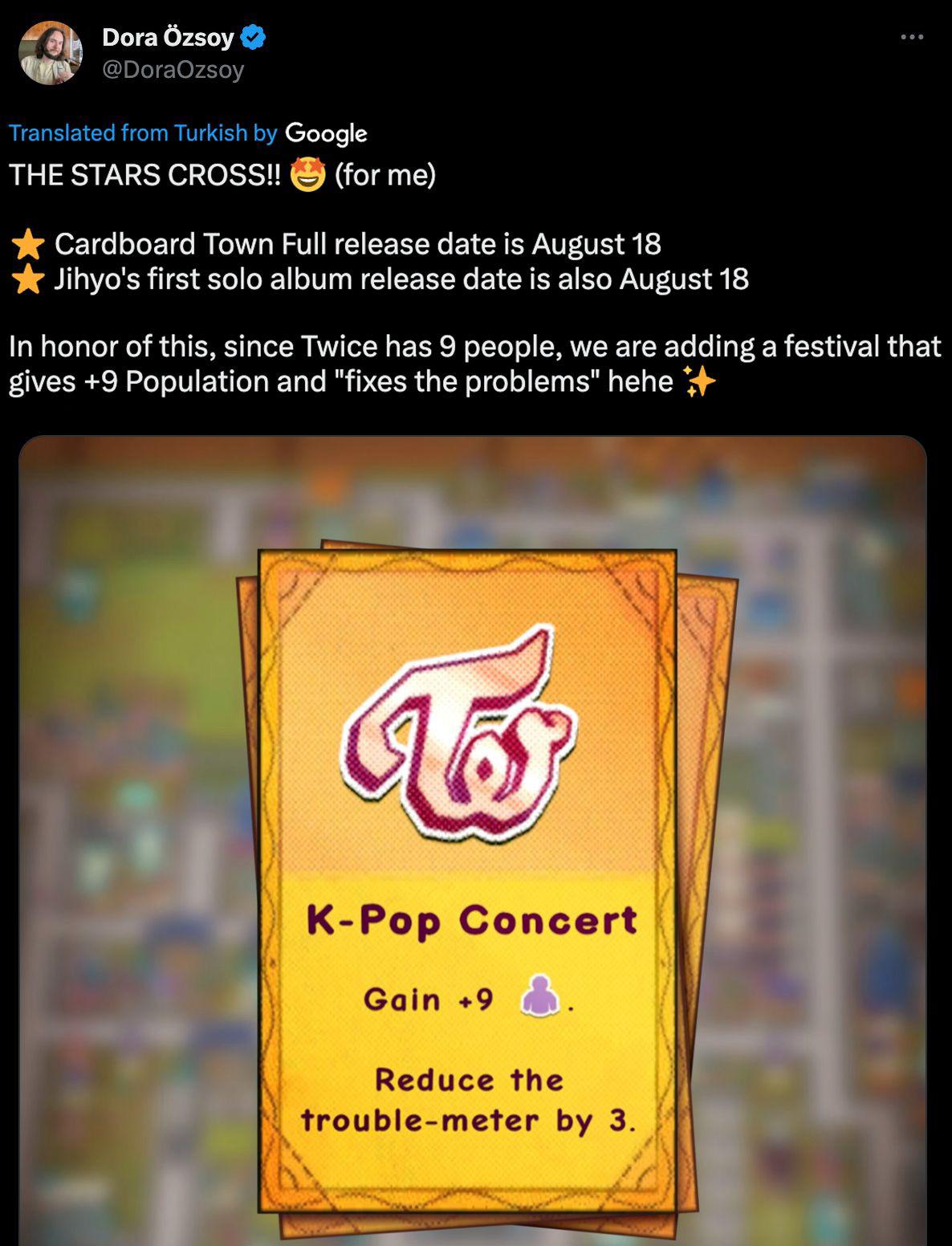 Muted_Land_885 on August 15, 2023 6:56 pm Context: Apperently developer is a ONCE and the game has in-game festivals and events. They’re adding a kpop concert to the list of random events because the game is coming out on the same day as Jihyo’s solo album.