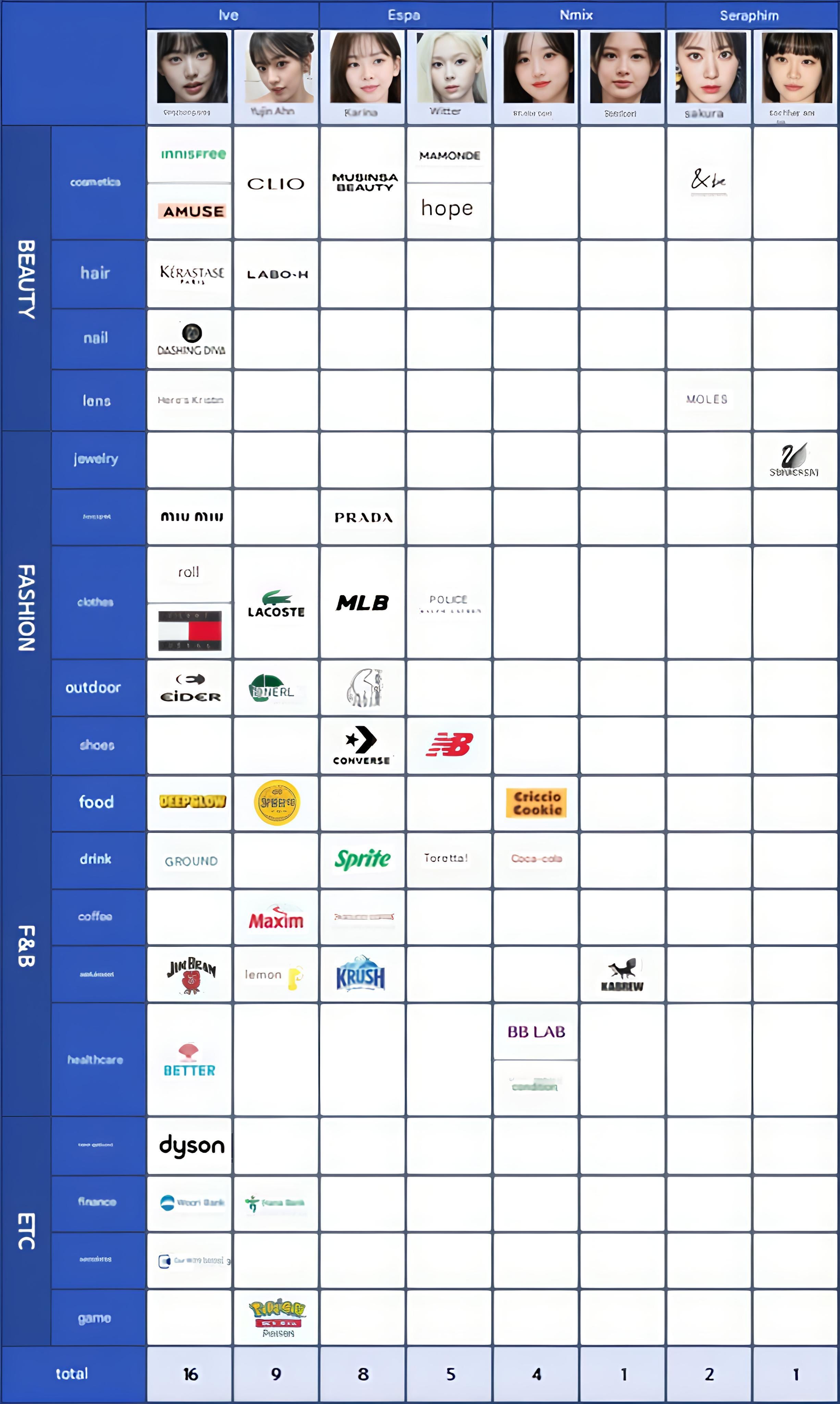 250518 IVE Wonyoung Break The Record now has the most brand deals of any 4th gen female idol , only jewelry , shoes ,coffee ,game brand columns have to fill in her brand deals May be we will see those rows also fill in future