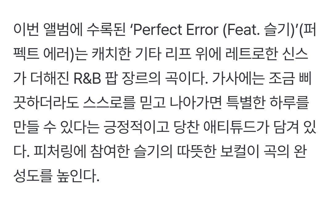 'Perfect Error' is an R&B pop song with retro synth on top of a catchy guitar rift. The lyrics express the positive and bold attitude that even if it's a bit off, you could make a day special by believing in yourself and moving forward. The warm vocals of Seulgi, who is featuring, increases the perfection of the song