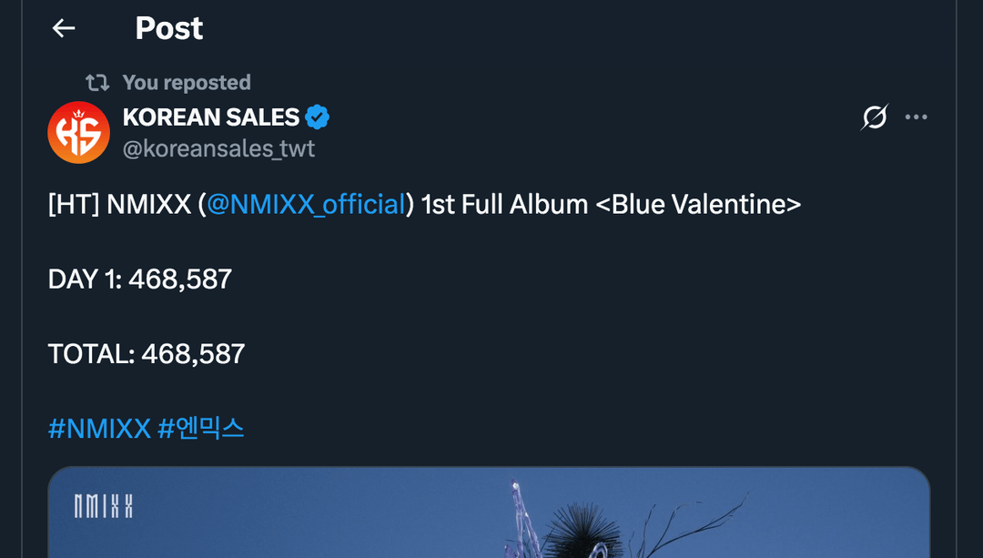 251014 – KoreanSales_twt Twitter Updates: NMIXX 1st Full Album ‘Blue Valentine’ records 1st Day Sales of 468,587 [on Hanteo; second only to the AMND single album in 2023]