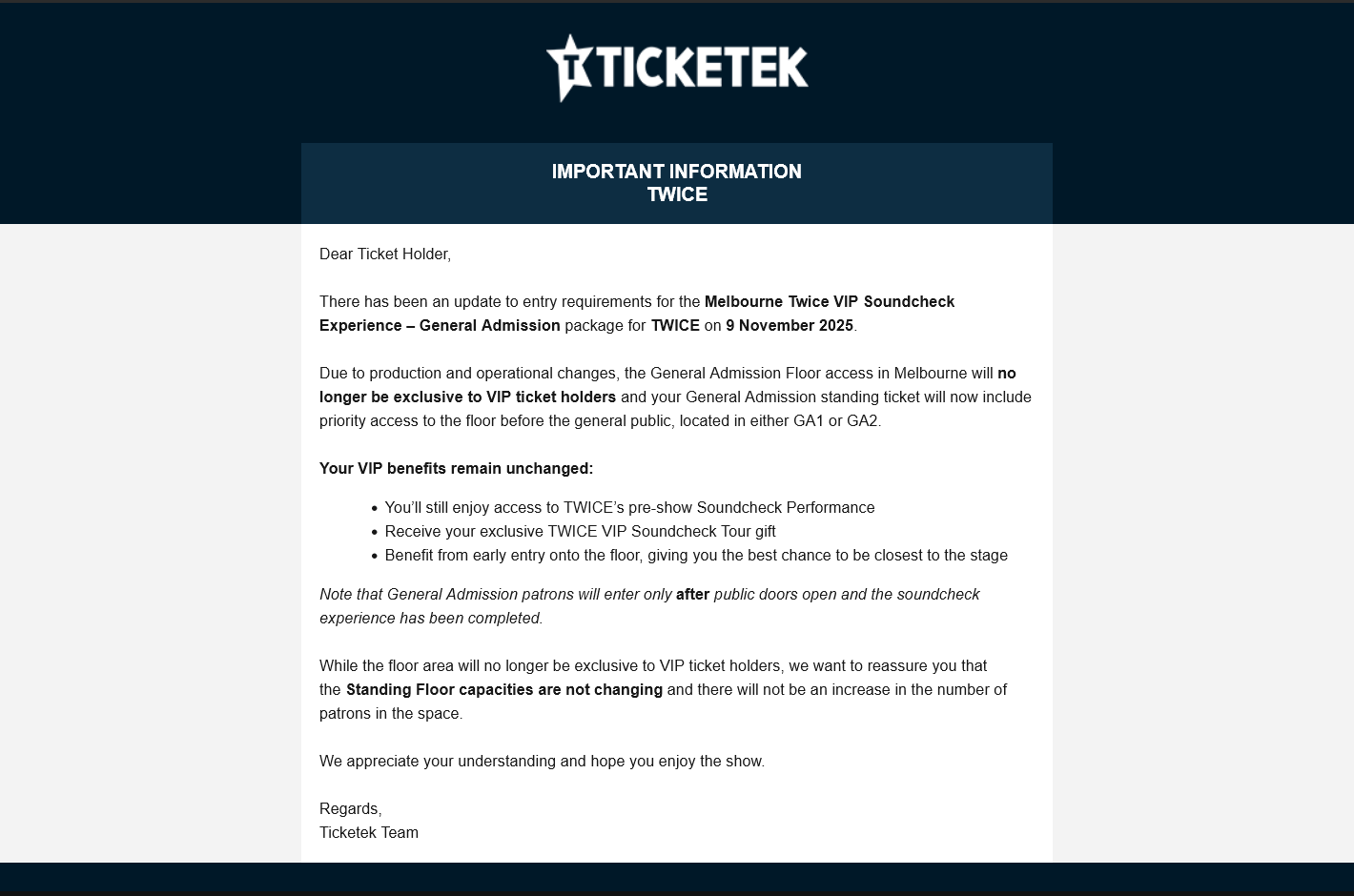 TICKETEK IMPORTANT INFORMATION TWICE – Regarding Melbourne TWICE VIP Soundcheck Experience – General Admission package for TWICE on 9 November 2025. Due to production and operational changes, the General Admission Floor access in Melbourne will no longer be exclusive to VIP ticket holders