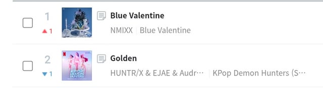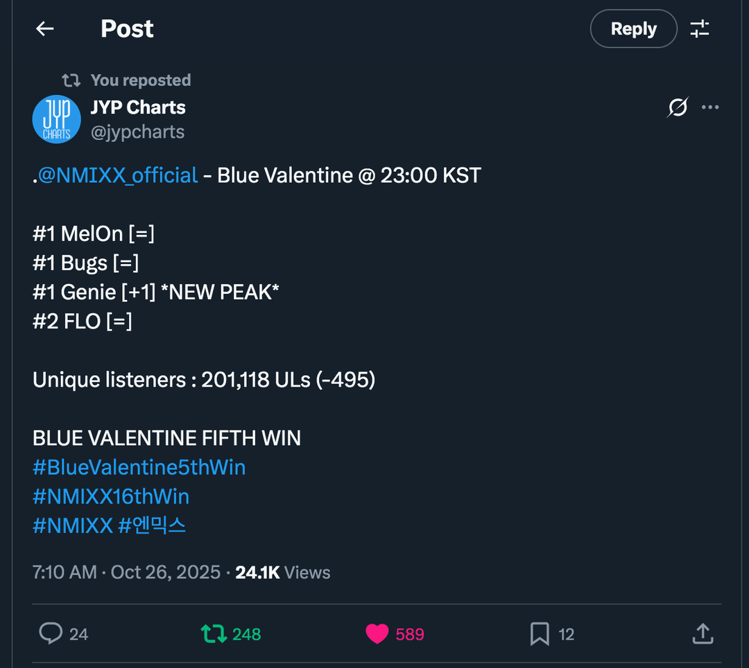 251026 – JYPCharts Twitter Update: Blue Valentine @ 23:00 KST hits #1 on Genie [*new peak*] but no RAK due to staying at #2 on FLO by veritek25 NMIXX 엔믹스