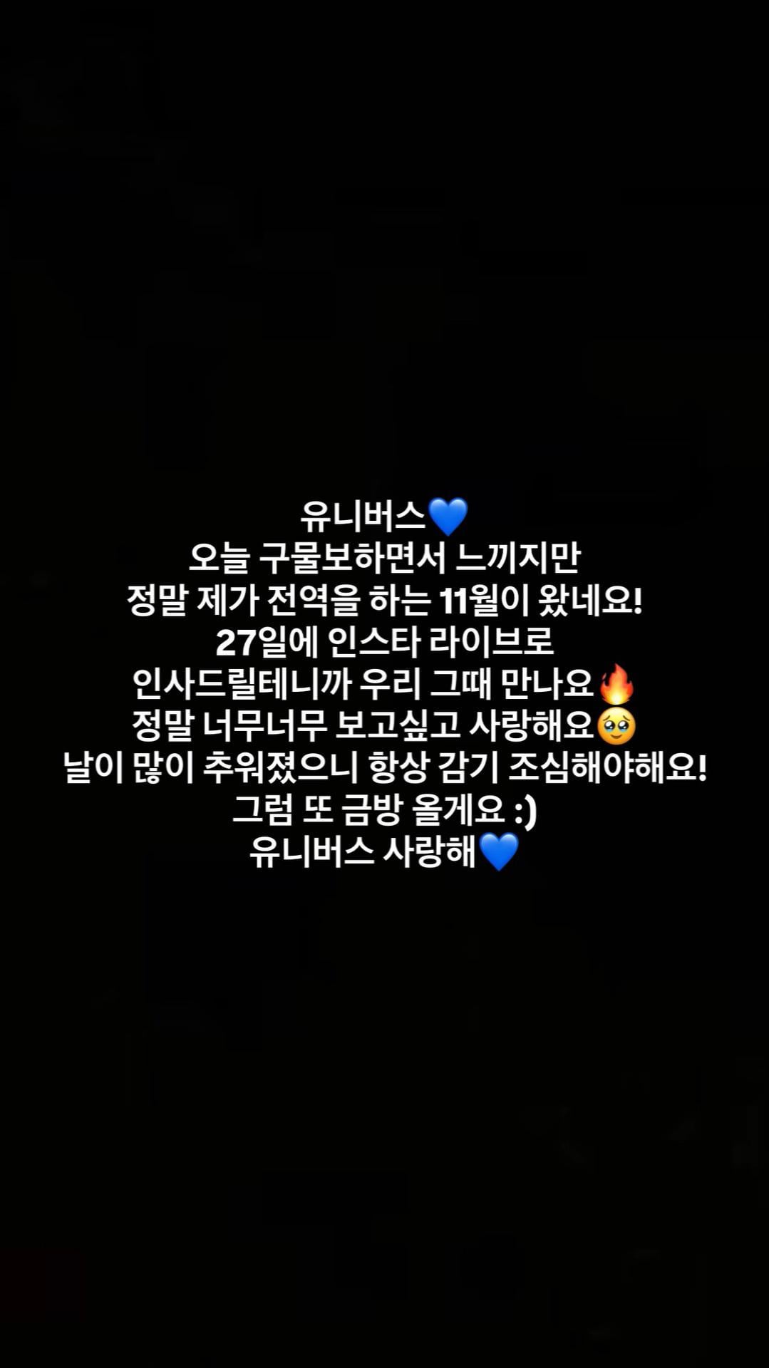 Today, after his regular weekend instagram Q&A sessions, he has announced through this instagram story post that he will do an instagram livestream on the same day he discharges to interact with universe (Pentagon fandom) as soon as he can.