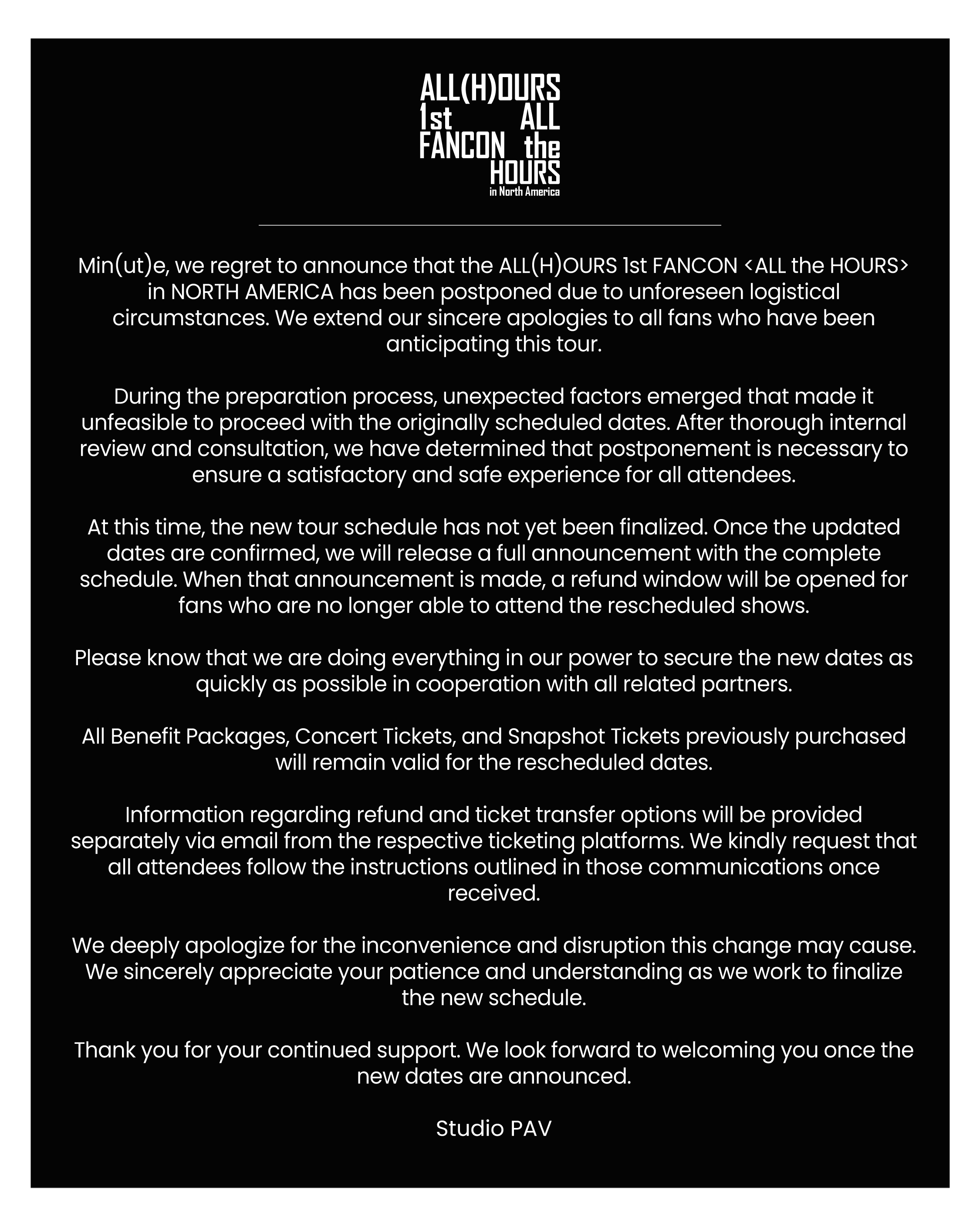 ALL(H)OURS’ 1st Fancon <ALL the HOURS> in North America has been postponed due to unforeseen logistical circumstances by chasetwogirls K-pop K-pop news KPop KPop news