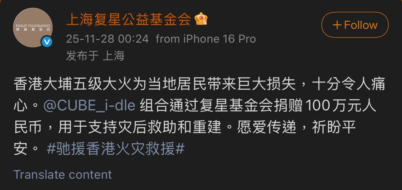 i-dle has donated 1 million RMB via the Fosun Foundation to aid relief and reconstruction efforts for the recent fire incident in Hong Kong