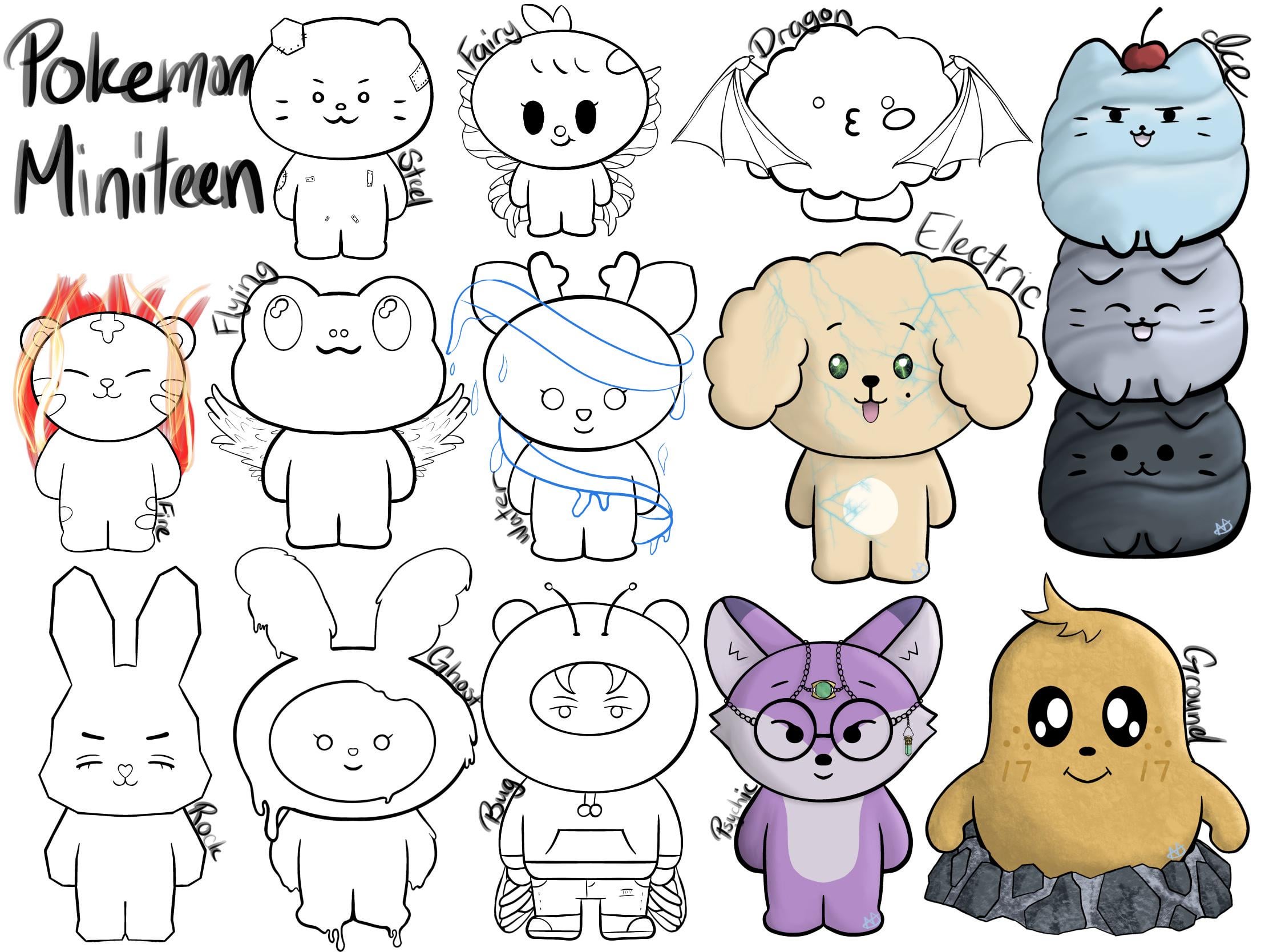 I have started to turn miniteen into Pokemon. 4 are completely done and I have the rest planned out. The goal is to eventually make them into actual cards once all are colored.