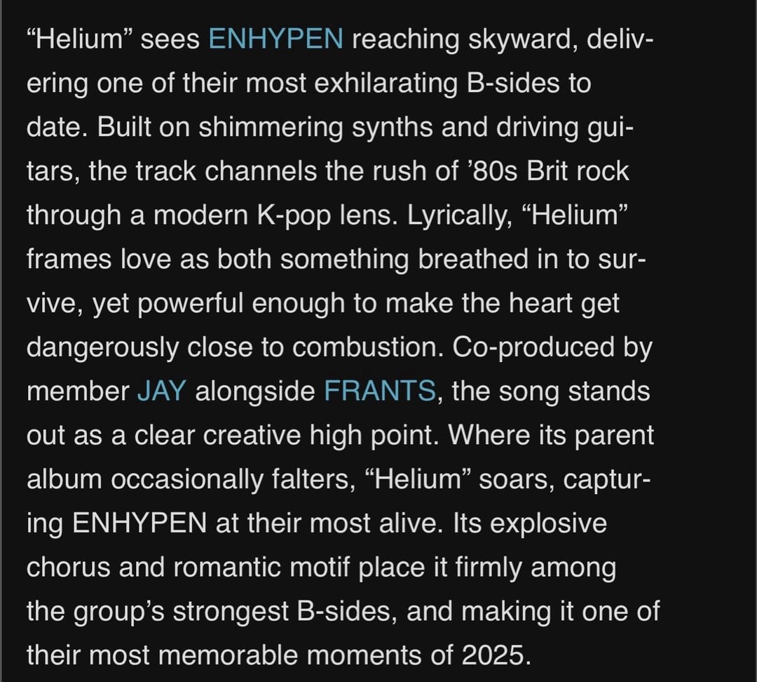 Specific_Cake_5410 on December 23, 2025 9:56 am Helium is such an Enha SOTY; it appeared in sooo many charts- congrats to Jay🎉🎊🥳💞