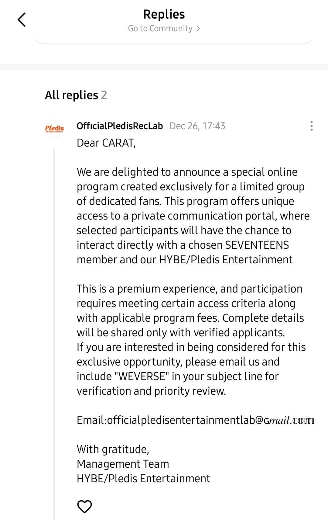 The fact that this is a Weverse reply, too, not even an official-looking fake email. I really hope no one else who got the same reply is naive enough to engage with this. Also, if there is a way to report the account or their message on Weverse, please do so.