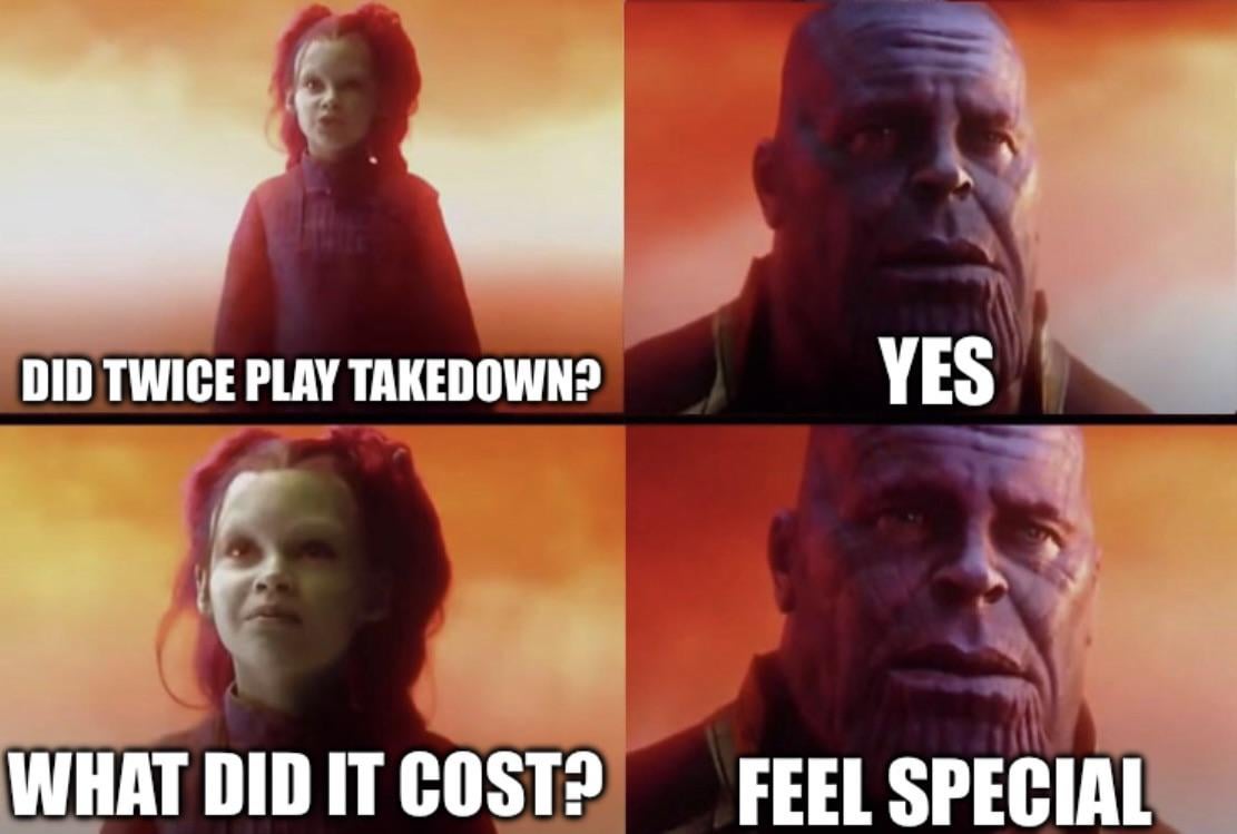 This meme is ~~only~~ accurate for the Vancouver concerts. According to the concerts after Vancouver, I should’ve put Likey instead of Takedown. Oh welp, I can’t edit this post so hooray for Feel Special! 🤷♂️🥳