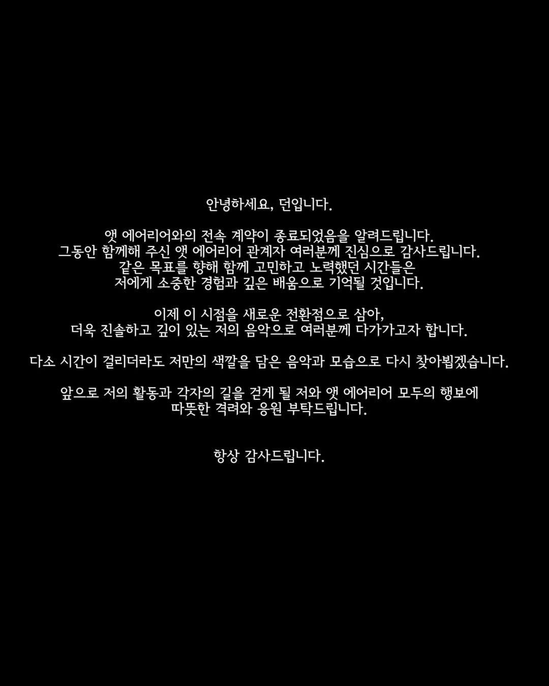 > I now see this moment as a new turning point, and I hope to reconnect with you through music that is more honest and deeper, truly my own. Even if it takes some time, I will return with music and a presence that fully reflect my personal color.