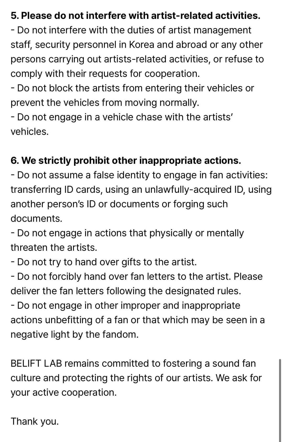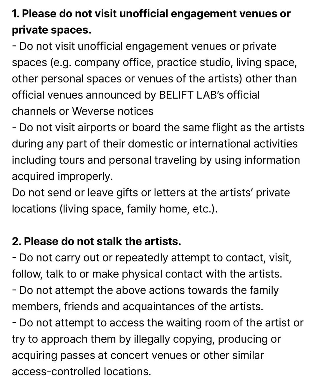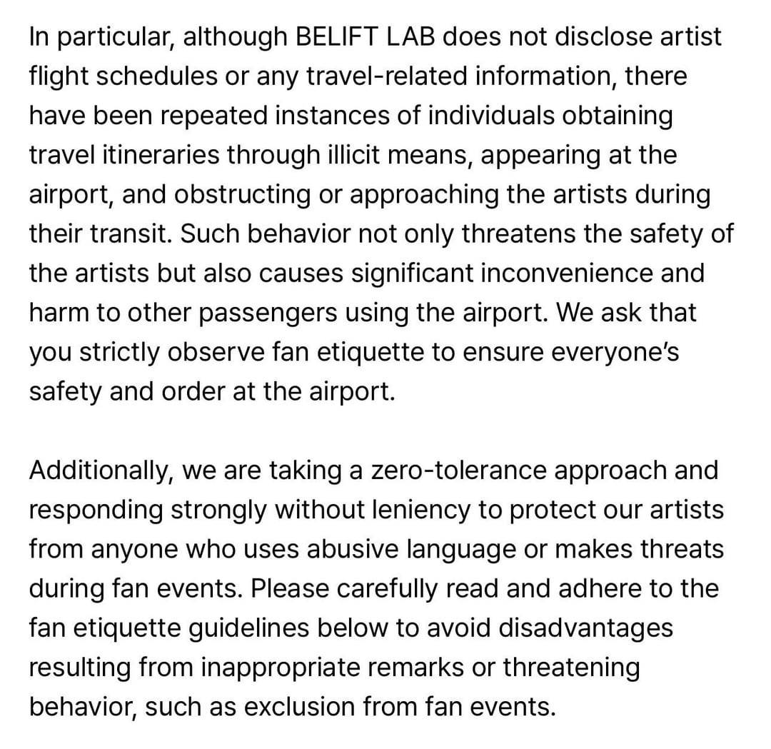 1. Honestly glad belift continues to call out these sasaengs. I know it can’t be an easy job having to deal with this kind of behavior, so I have to respect the ones who enforce the rules. This statement doesn’t dodge anything, it’s crystal clear and easy to understand, so it makes me hopeful that they’re going to really crack down on the people who do this type of stuff.