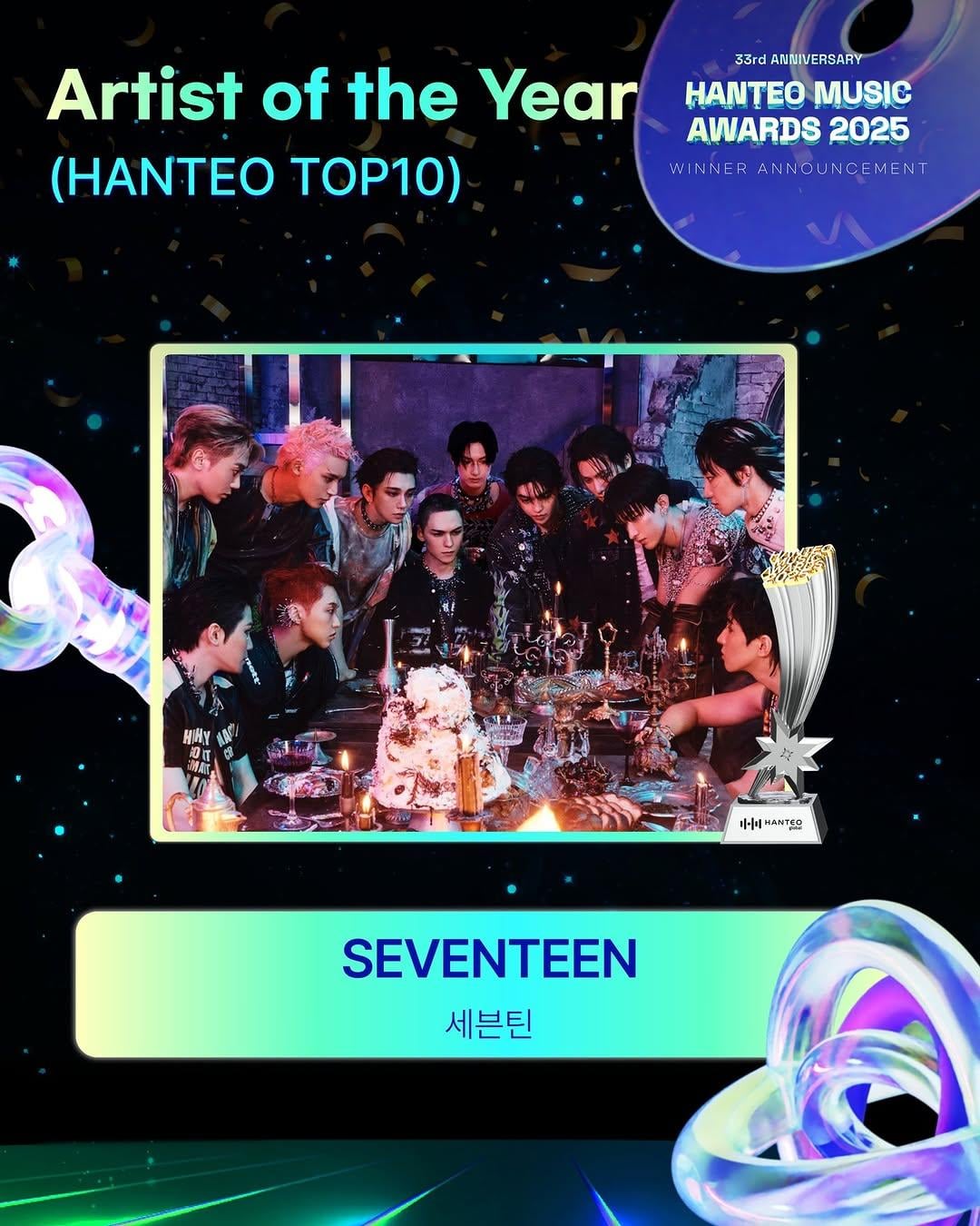 princessgojo on February 15, 2026 12:14 pm [source](https://www.instagram.com/p/DUxxpQBEWji/) Caption: #HMA2025 #HanteoMusicAwards2025 š Artist of the Year (HANTEO TOP 10) #SEVENTEEN #Seventeen @saythename_17 Congratulations on your award from the bottom of our hearts! #HanteoMusicAwards2025