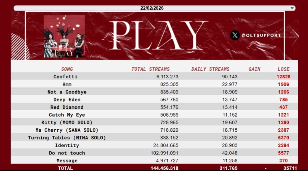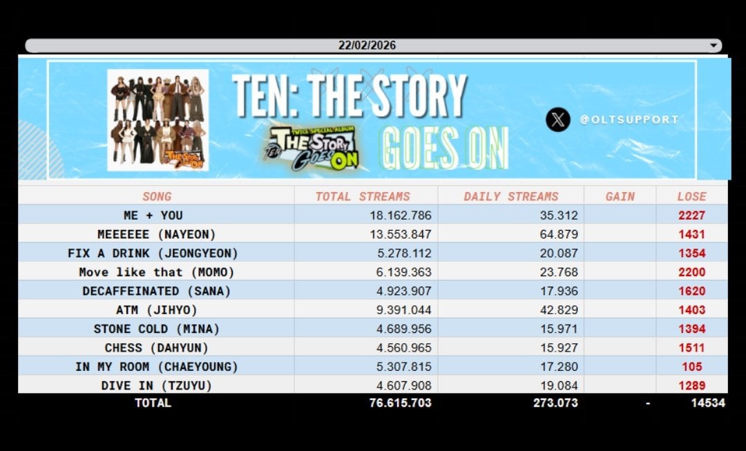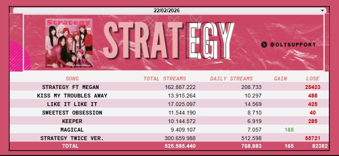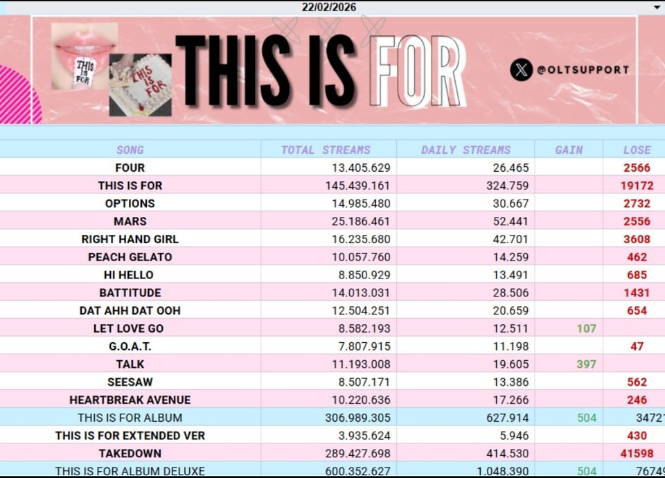 260223 OLTSupport Twitter Update – “THIS IS FOR (DELUXE)” has surpassed 600 MILLION streams on Spotify! TWICE was also the most streamed Kpop Girl Group on Feb 22, now 163 days in a row on the platform. Corbyn’s “BLINK” ft. TZUYU has surpassed 20 MILLION on Spotify.
