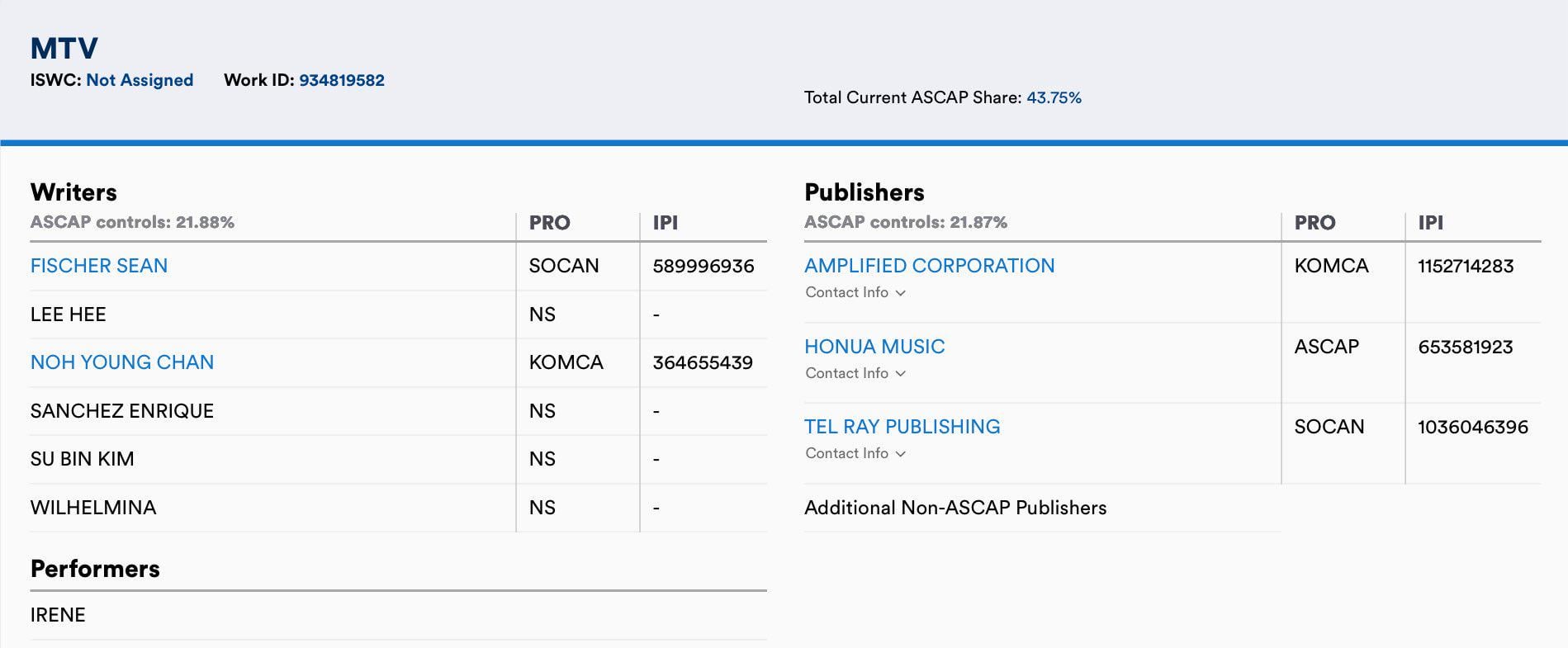 260228 A song entitled “MTV” has been registered in ASCAP under Irene’s name by SapphireHeaven Red Velvet 레드벨벳