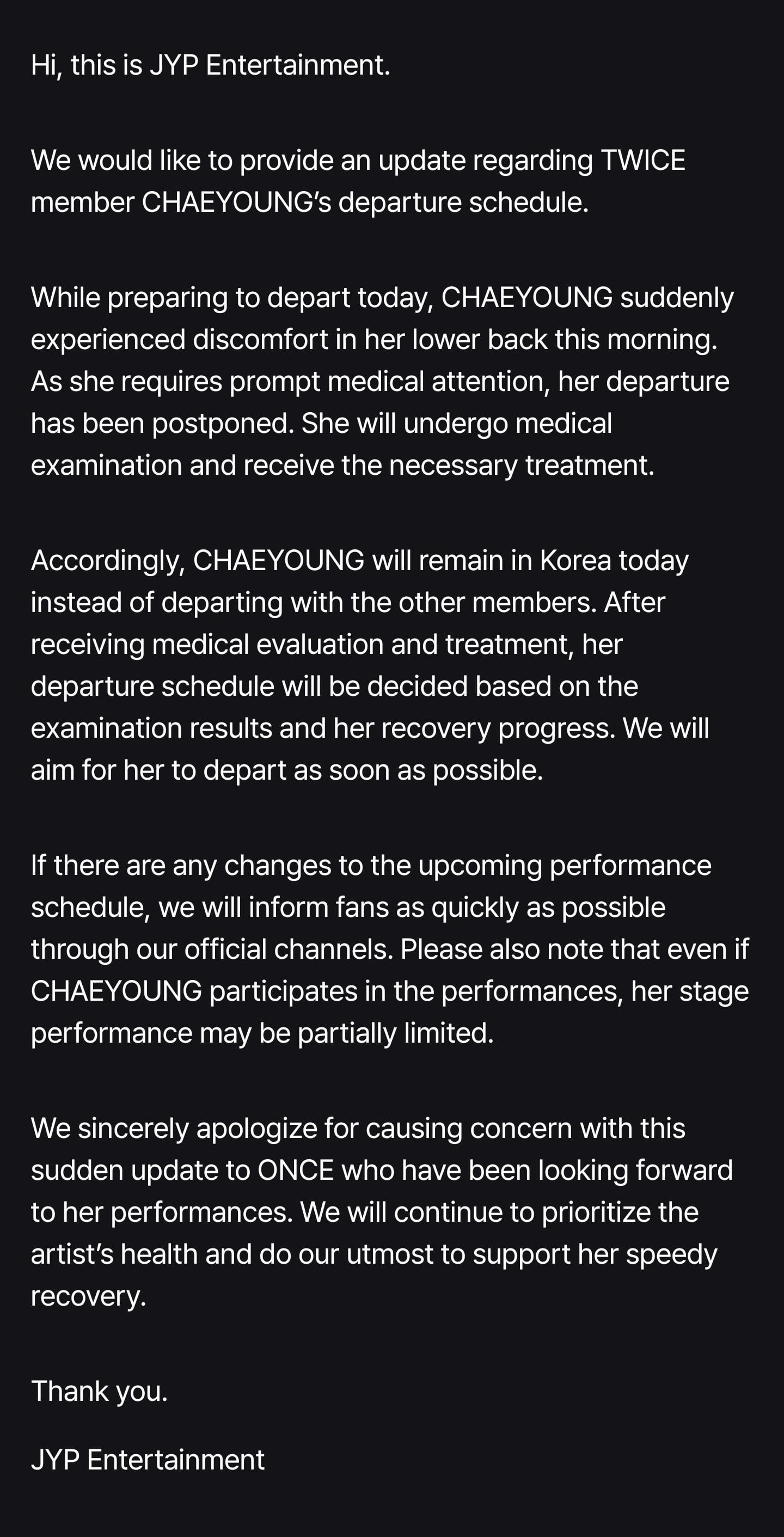 Accordingly, CHAEYOUNG will remain in Korea today instead of departing with the other members. After receiving medical evaluation and treatment, her departure schedule will be decided based on the examination results and her recovery progress. We will aim for her to depart as soon as possible.