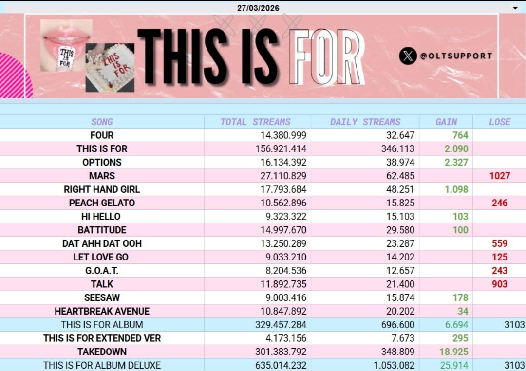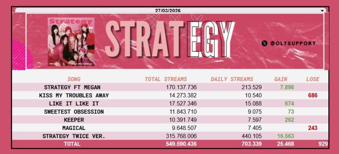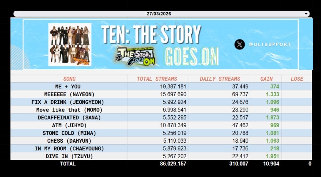 260328 OLTSupport Twitter Update – TWICE has reached 500 Million streams on Spotify so far in 2026, in just 85 days. They remain as the 2nd most streamed K-pop Girl group daily gaining +5.83M [+172,288] streams on Spotify yesterday.