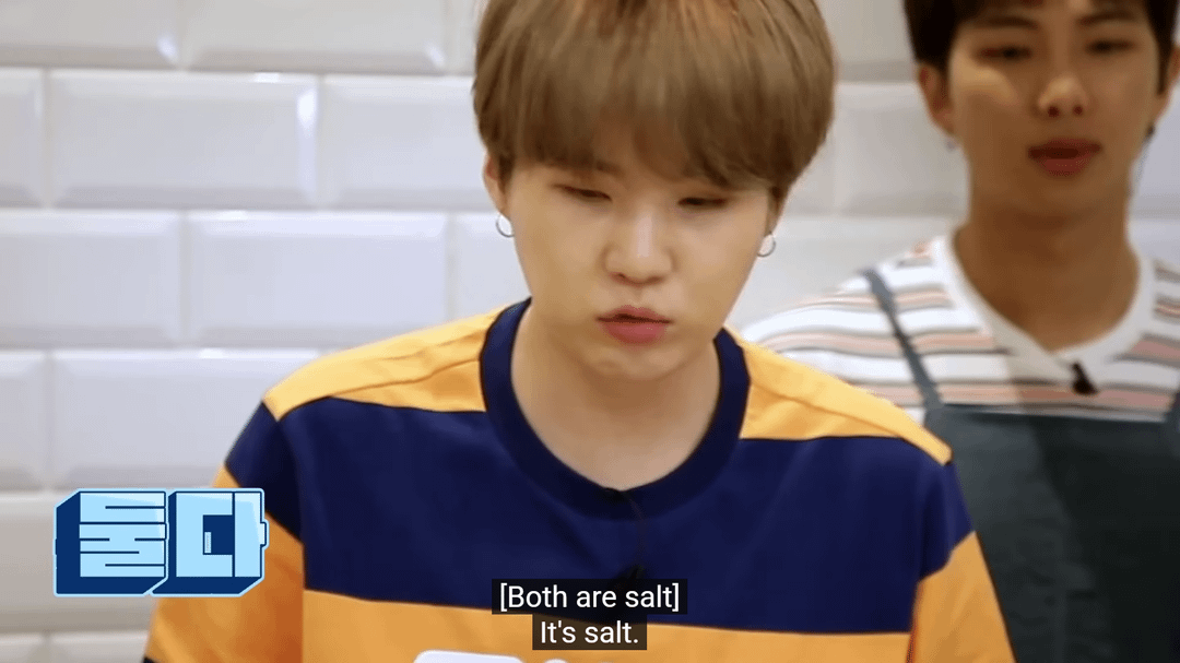 Ep 103-104 SUGA struggling instruct RM and Jimin in the kitchen and failing when they put too much salt. You can see his frustration but he just playfully scolds them 😂🤭