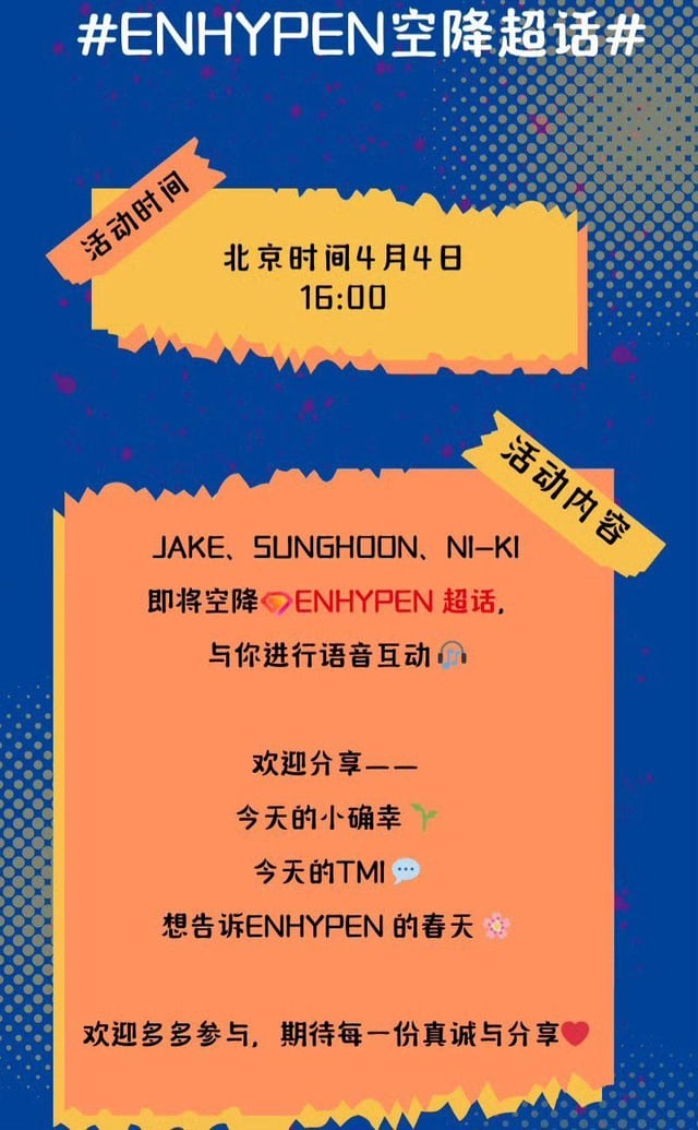 📍source 📅 April 4, 16:00 (Beijing Time) 17:00 (Korea Time) Topics: 🌱 Today’s small happiness 💬 Today’s TMI 🌸 A spring message you want to share w/ ENHYPEN by moonie-moon ENHYPEN