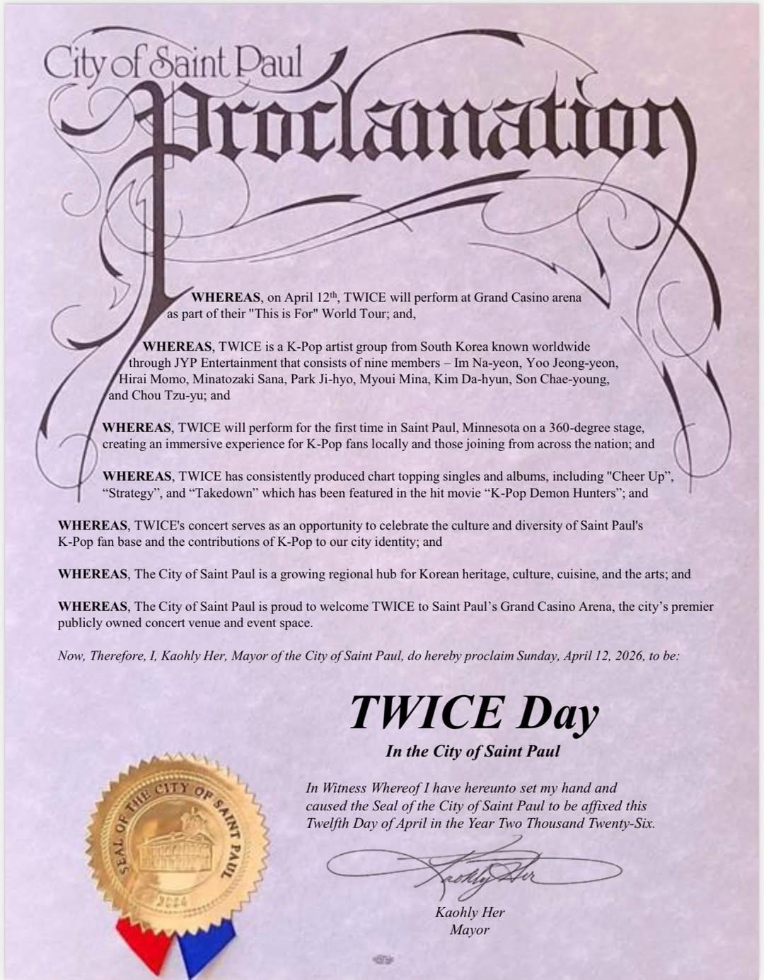 >A statement from Mayor Her: “I am proud to proclaim Sunday, April 12, 2026, as TWICE Day in the City of Saint Paul. TWICE’s headlining concert is a landmark moment, highlighting the global impact of K-pop and bringing an exciting cultural experience to our city. As the first Asian American elected mayor of our Capital City, I am especially honored to welcome TWICE to Saint Paul.” [u/fox9](https://www.instagram.com/fox9/) [#kpop](https://www.instagram.com/explore/tags/kpop/) [#minnesota](https://www.instagram.com/explore/tags/minnesota/) [#twice](https://www.instagram.com/explore/tags/twice/)