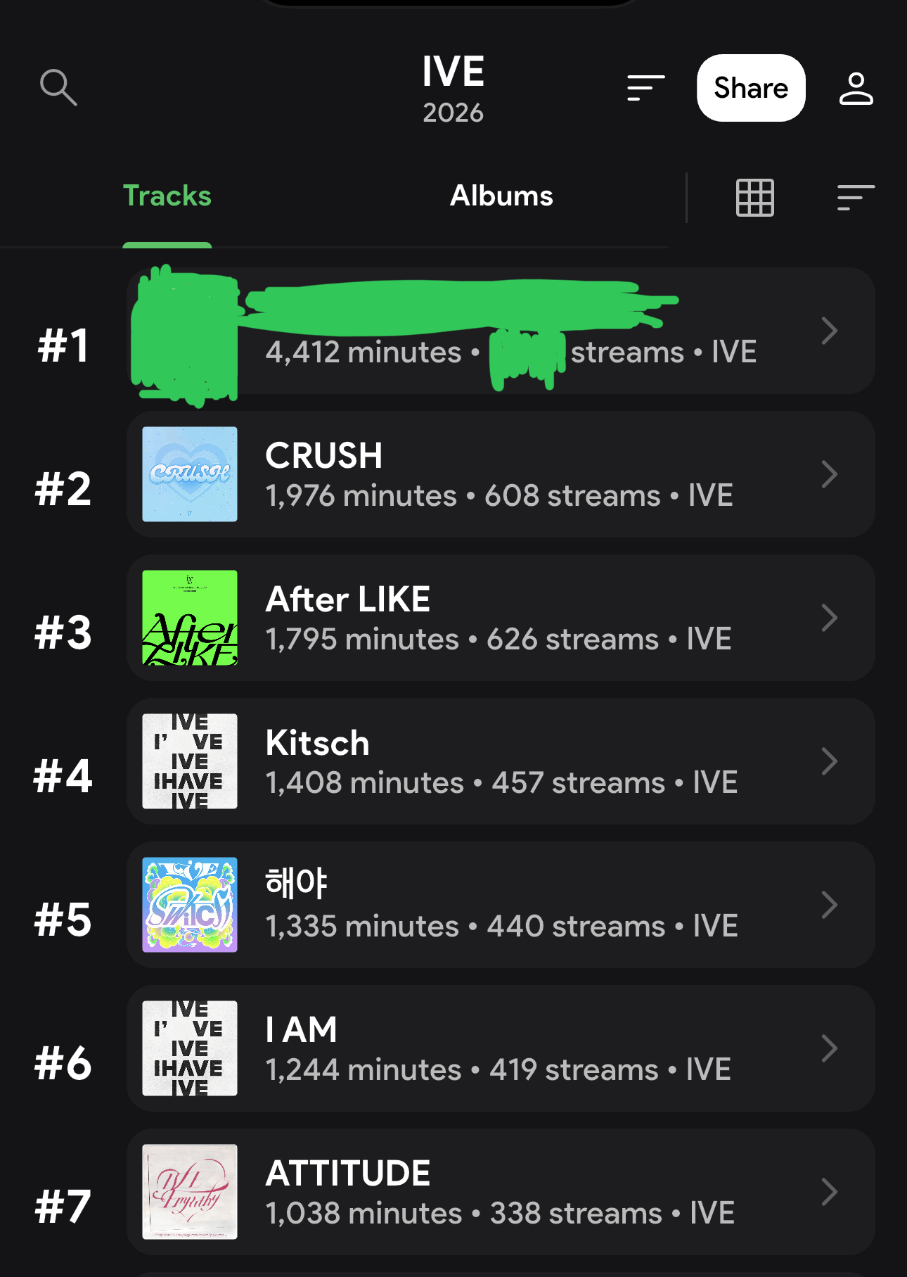 2. I am more curious about it sorting by total minutes rather than streams, which I would have thought was a more positive indicator. Anyhoo, you seem to like ‘old school’ IVE (maybe Kpop years are like dog years for that to make any sense) I will guess Shine with Me, @ 1325 streams